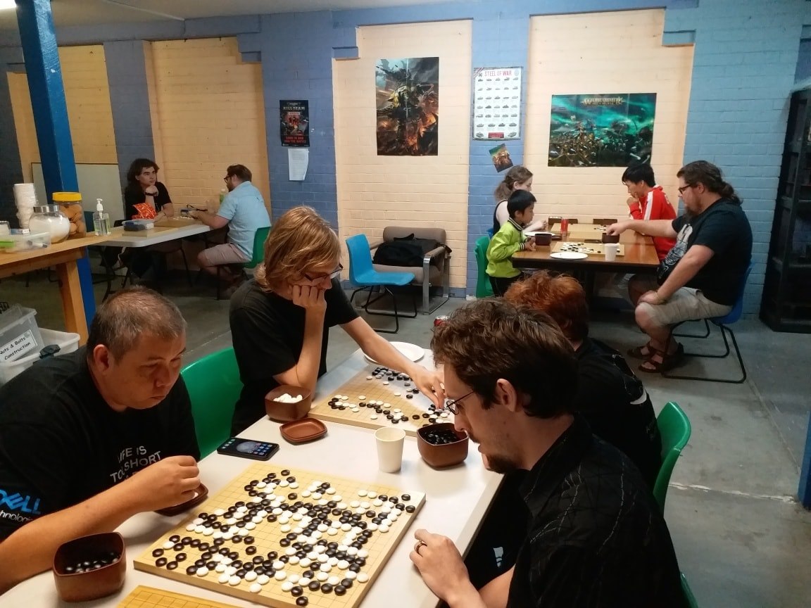 On the 19th of January, the Brisbane Go Club had the first pizza night meeting for the year! It was a relatively quiet night, with 9 attendees, including both strong players like Heiwei Yang (6d) and Elizabeth Patrick (2d), and beginners like Rhuaidi Burke.